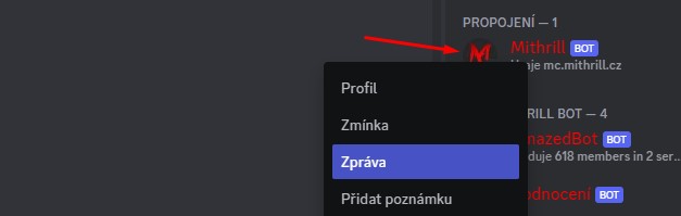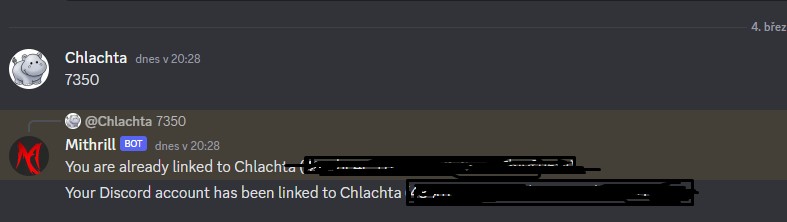V případě, že je vše správně, Mithrill bot vám napíše, že "Your Discord account has been linked to VášMCNick"